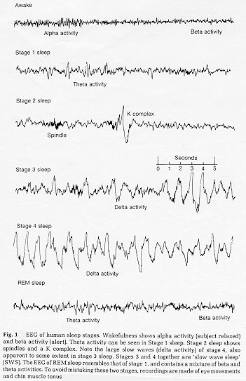 we've settled ourselves down to sleep, this activity turns into alpha waves, (6-8Hz). Stage 1